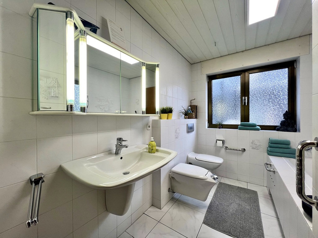Das Herzstück des Hauses ist der große Wohn- und Essbereich mit halboffener, voll ausgestatteter Küche. Hier lässt sich gemeinsam kochen, essen und entspannen. Große Fenster sorgen für viel Tageslicht und eine angenehme Atmosphäre.
